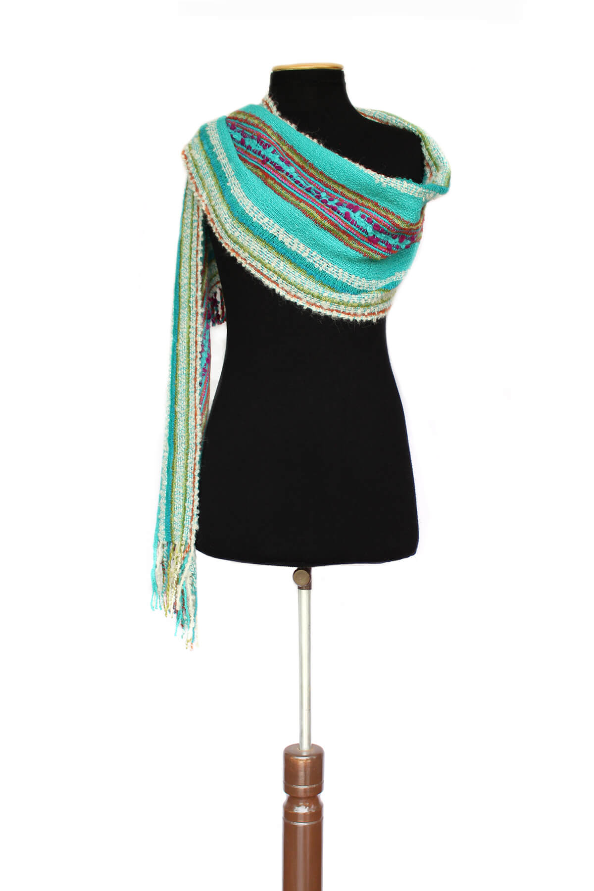 Elaboradas en telares artesanales. Acabados manualmente. Combinación de colores turqueza, blanco y fucsia